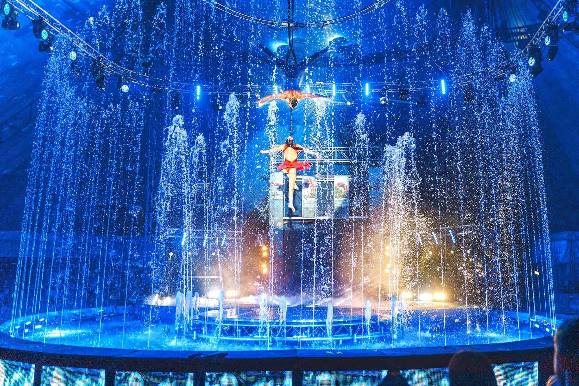 Im Zentrum steht eine aufwendig inszenierte Bühne mit einem Pool aus rund 120 Tonnen Wasser. Tausende Fontänen schießen in die Höhe, Wasser schwebt unter der Zirkuskuppel, Licht- und Soundeffekte sorgen für eine fast schon magische Atmosphäre. Die Manege wird dabei selbst zur Wasserfläche – und zieht das Publikum mitten ins Geschehen.